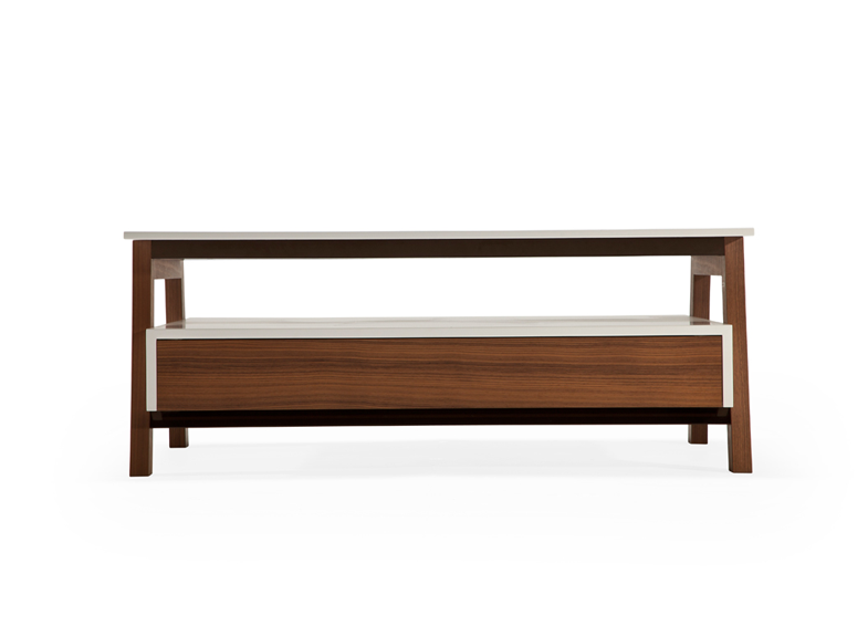 This coffee table captures the light of sunny mornings. It has a friendly, natural air to it, ageless and adaptable to any space. Walnut, white top and brown legs, with a low posture, very spacious with a built-in drawer where you can store your magazines and what not.