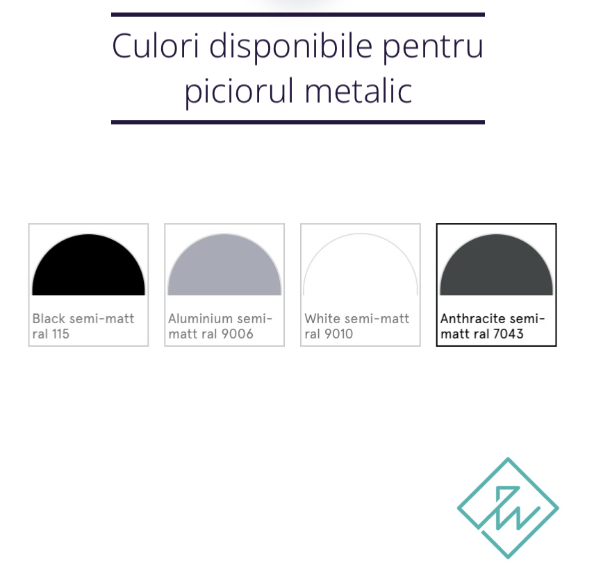 Opțiuni de culoare a cadrului metalic (Oțel, acoperit cu pulbere) - Negru RAL 9005 (similar), Aluminiu RAL 9006 (similar), Antracit RAL 7043 (similar), Alb RAL 9010 (similar).