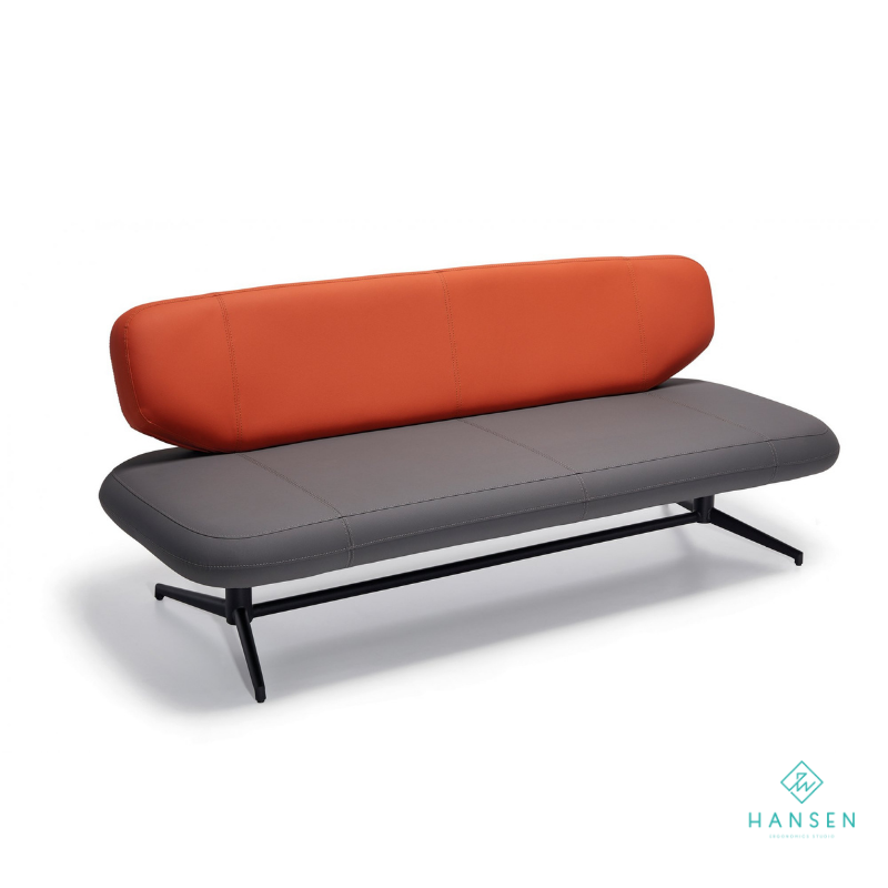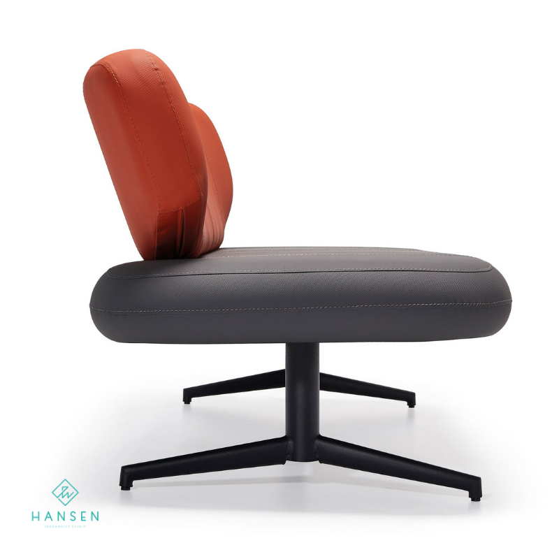 · Structură și Tapițerie: Construită pe o structură interioară rezistentă din metal. Șezutul este tapițat cu piele ecologică sau material textil durabil (gri închis), cu detalii de cusături orizontale. Spătarul este un volum cilindric generos, tapițat cu textil contrastant (portocaliu/teracotă, sau la alegere), oferind un suport lombar moale și confortabil.