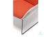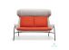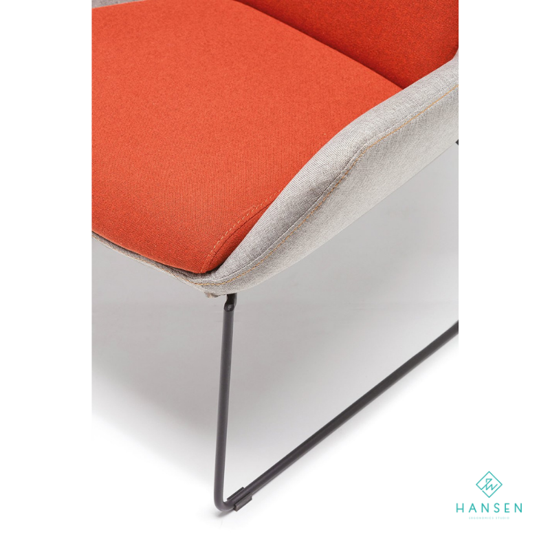 · Structură și Tapițerie: Cadrul este solid, încorporat în tapițerie. Tapițeria exterioară este realizată dintr-un textil de înaltă densitate (gri deschis), iar pernele interioare (șezut și spătar) sunt tapițate cu un textil moale, de culoare contrastantă (portocaliu vibrant).